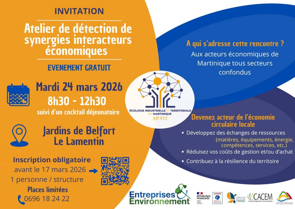 Un atelier de détection des synergies est co-organisé par la CRESS Martinique le mardi 24 mars 2026, de 8h30 à 12h30 au jardin de Belfort, au Lamentin. L’événement sera suivi d’un cocktail déjeunatoire.