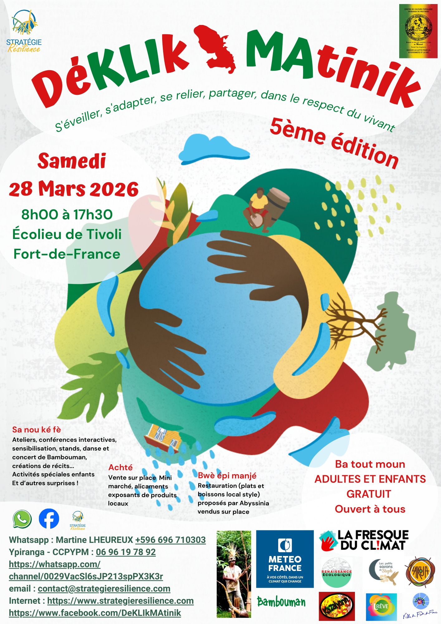 « S’éveiller, s’adapter, se relier, partager, dans le respect du vivant ». Par ces mots, l’invitation est lancée à destination des habitants du quartier et de l’ensemble des Martiniquais pour participer à cette nouvelle édition de Deklik Matinik et qui se tiendra le 28 mars 2026, de 8h00 à 17h30 à l’écolieu de Tivoli. Une « journée conviviale, qui donne envie de s’informer, d’échanger, de découvrir, de partager, seul ou en famille, sur des thématiques qui nous concernent tous, au quotidien et pour notre futur », annoncent les organisateurs.