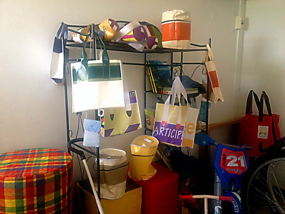 Marlène est la couturière à l’association depuis deux ans et son rôle est d’aider les gens avec tout ce qui concerne le textile, comme les retouches de vêtements, le montage d’une fermeture éclaire et aussi la transformation. Marlène fabrique aussi des sacs à partir de matériaux recyclés tels que des chutes de stores, des voiles de yoles et des banderoles publicitaires usagées. Il y a une petite boutique à l’entrée où ces sacs sont vendus ainsi que d’autres objets confectionnés ou réparés. Le principe est toujours le même. Il y a une petite cagnotte à l’entrée du Repair Café et les gens donnent selon leur capacité monétaire.