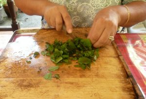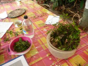 Une première substance active extraite lors de l’atelier est présente dans les feuilles de basilique et une deuxième dans les fleurs de moringa. Suite à la récolte, les parties des plantes sont rincées afin d’éliminer tous types de dépôts qui pourraient se retrouver sur la plante. Ensuite celles-ci sont ciselées afin de briser leurs parois cellulaires et ainsi faciliter l’extraction de la substance active. Finalement, après un dosage méticuleux du végétal et du solvant, on inocule la partie de la plante dans l’éthanol. La plante devra rester un certain temps dans l’éthanol avant que les substances actives soient extraites.