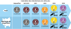 La Ville de Paris a annoncé l’interdiction de la circulation des véhicules diesel à partir de 2024 et des véhicules essence à partir de 2030. La fin des véhicules diesel en 2024 sera quant à elle progressive selon un calendrier voté par la Mairie de Paris, en fonction de la classe environnementale du véhicule définie par les vignettes Crit’Air (certificats qualité de l’air). Ce système est la première application concrète de la loi sur la transition énergétique d’août 2015.